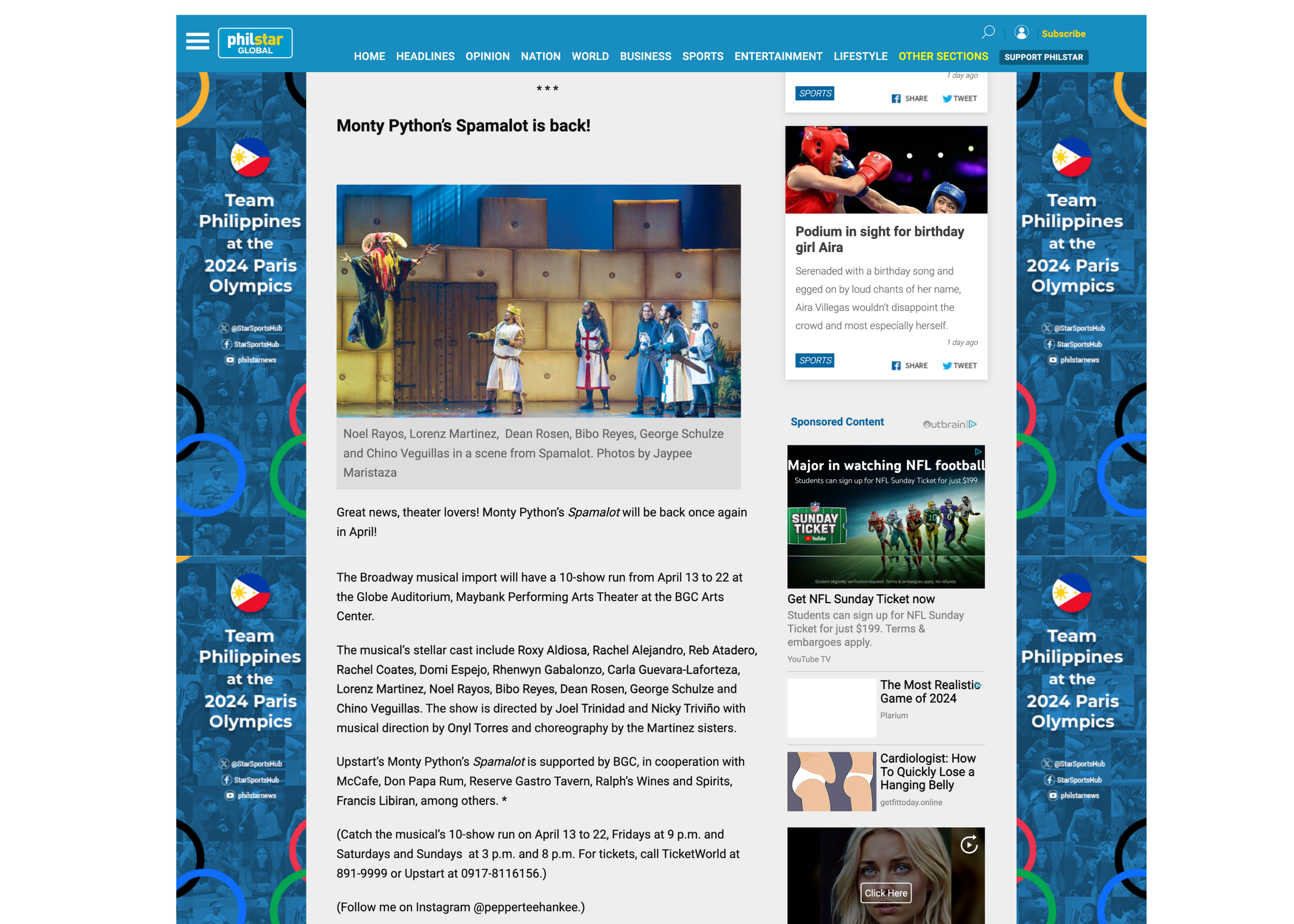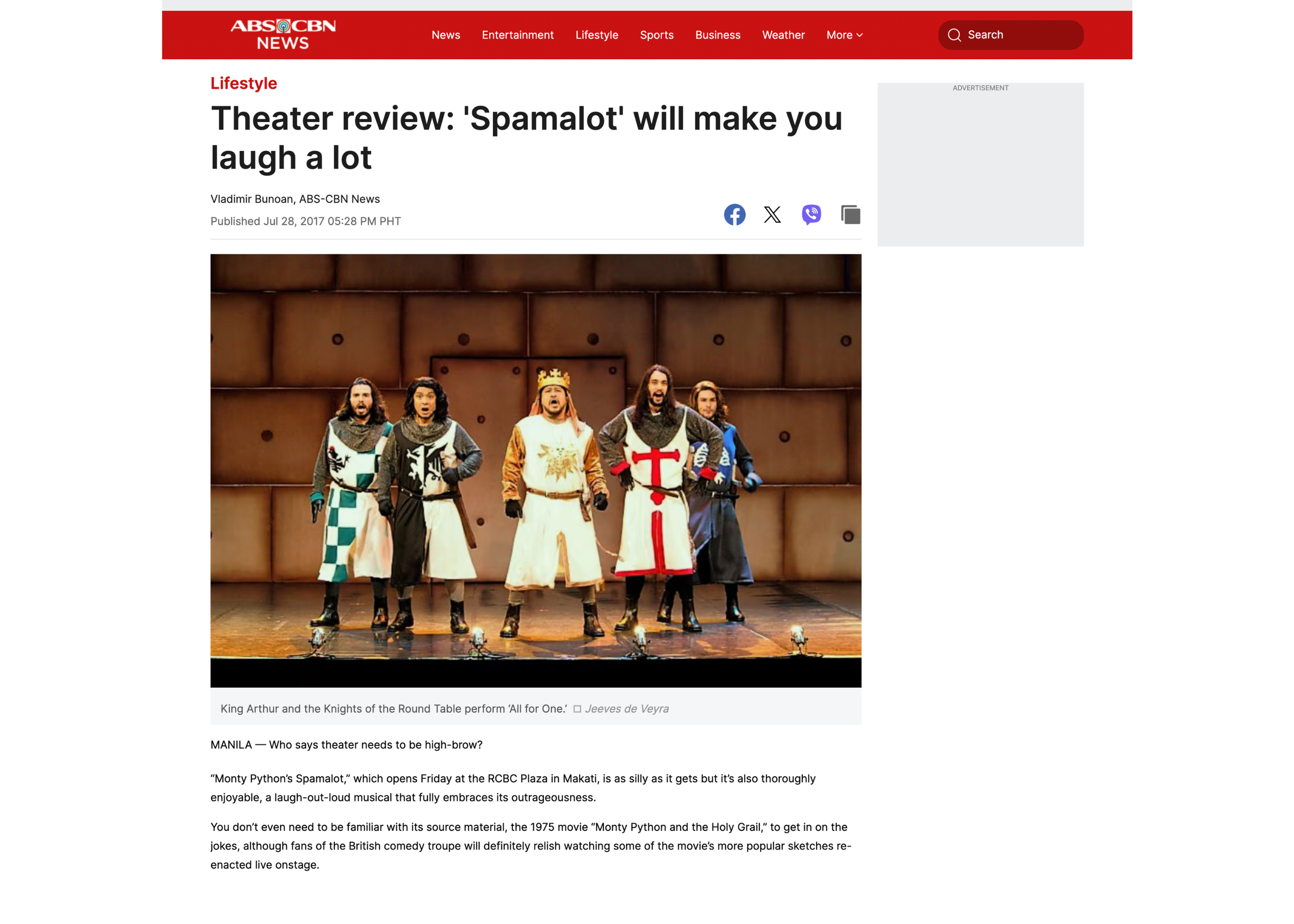 “Spamalot is a laugh-out-loud, watch-someone-get-beheaded-by-a-killer-rabbit good time! Joel Trinidad, Nicky Triviño, and their merry cast and crew have created a hilarious, must-see show for peasants and royalty alike.”